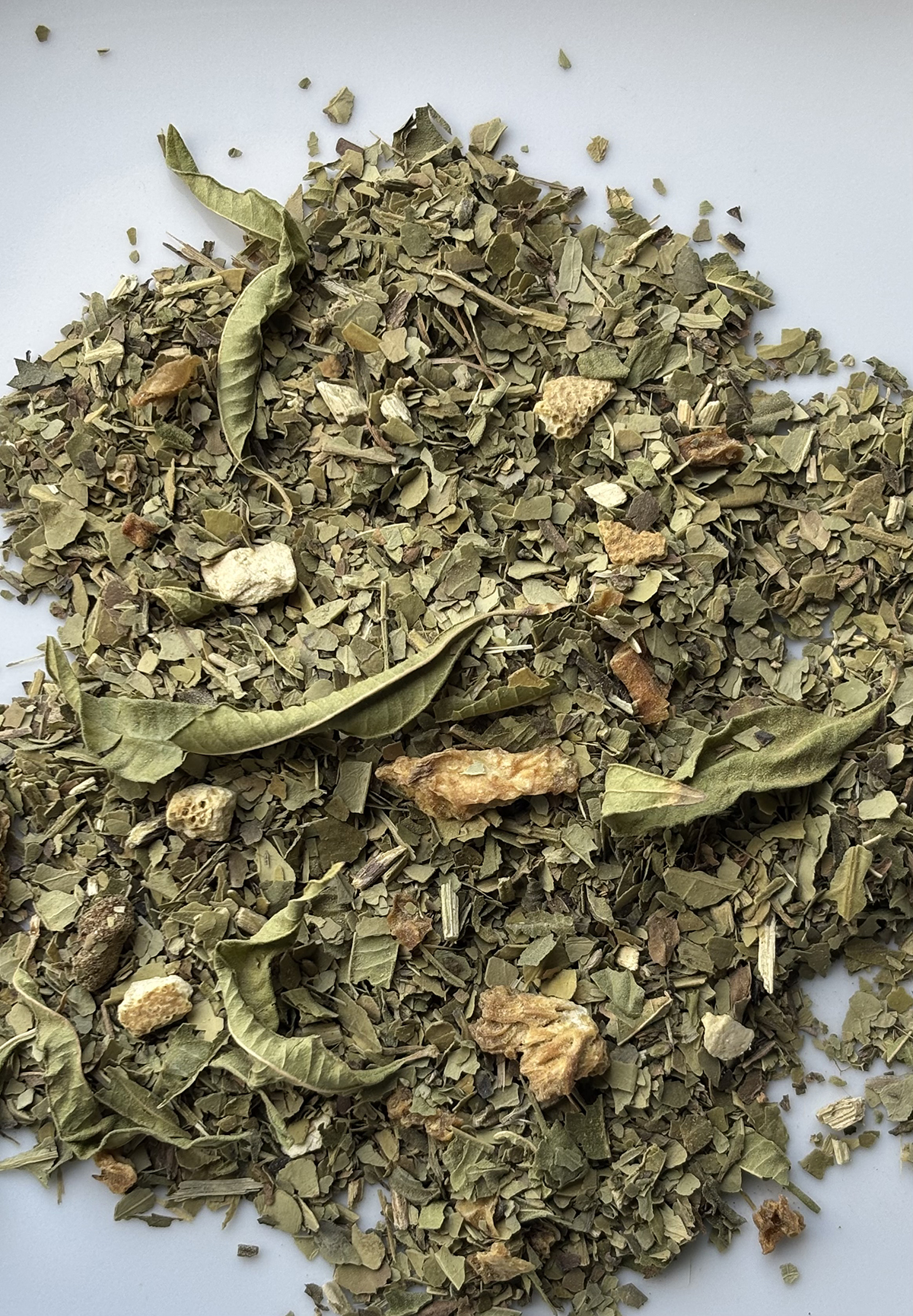 Maté vert (70%), écorces d'orange, écorces de citron, papaye, menthe, verveine, arôme naturel, verveine entière, thé vert Matcha, guarana, grenade. Mélange premium élaboré avec des ingrédients issus de l'agriculture durable et des arômes naturels.
